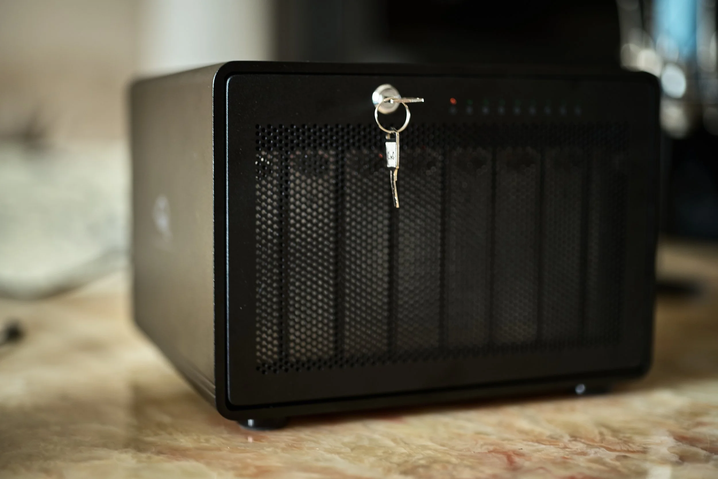 The only challenging part of setup is software and RAID setup. If you are on Mac, OWC has a video guide on how to navigate the security settings to allow the storage device to work as one usable drive on your computer. Disk failure is a real risk for your data and selecting the correct raid format will affect performance. RAID 5 is common and the structure I used so that even if a disk completely fails, data is still fine. This is accomplished by dispersing data over all 8 drives, and also reduces the total storage from 128T to 112T. It’s more secure but takes up more space and can be slower/louder than the other configurations. When you are finished setting up you have the option to verify your drives and check for disk health. As I have 8 large capacity drives, this took a long time, about 5 days. I would say this step isn’t truly necessary but if you don’t trust the source of your drives then I would say it’s worth considering if you want to put your mind at ease. If there are any potential risks, the SoftRAID app for Mac (not hardware, but rather software with an unnecessary subscription option) will alert you so you can replace the drive. After the RAID is set up, you can access the DAS like any SSD or flash drive by plugging it into your device, just make sure you fully eject before pulling out the cable. Disks have the highest likelihood to fail when spinning up, but I think it’s a non-factor if you’re worried about disconnecting the Thunderbay when not in use.